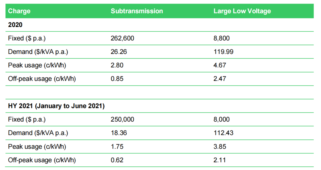 正如之前報告提及,向 Powercor 注冊 GSF 和 GESS 電網(wǎng)接入需繳納 Powercor 征收的 DUOS 費用。由于 GESS 是主要負(fù)荷源,因此大部分 DUOS 費用都會流向 GESS。分配給組合系統(tǒng)的DUOS 是子輸電類別(ST),通常為子輸電客戶(而不是發(fā)電機組)使用。在連接 GESS 之前,GSF 僅受大型低壓(LLV)電價等級的約束,其中輔助功耗的最大夜間負(fù)載較低(約為 150kW),因此這不是材料成本的負(fù)擔(dān)。相比之下,現(xiàn)在對 GESS 征收的固定費用和需量費用相當(dāng)可觀。表 4 概述了 2020 年和 2021 年上半年適用的每個 ST 和 LLV Powercor 費率類別的費用。