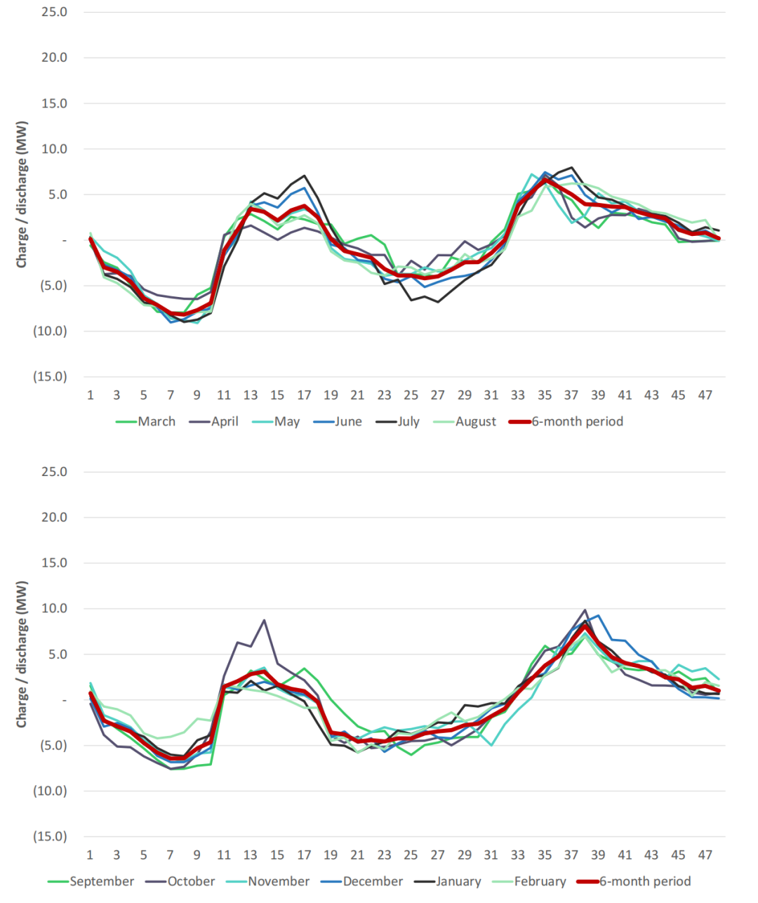 從能源市場的角度來看,圖 4 和圖 5 分別概述了 GESS 第 2 年的平均運營狀況和維多利亞州交易時段的價格。GESS的運營策略與第一年基本沒有變化,即遵循能源市場價格,早晚高峰價格對應(yīng)一天中的兩種放電模式。正如第 2.2.2 節(jié)中進一步討論的,GESS 主要在清晨充電,盡管這樣做會產(chǎn)生網(wǎng)絡(luò)使用費用。