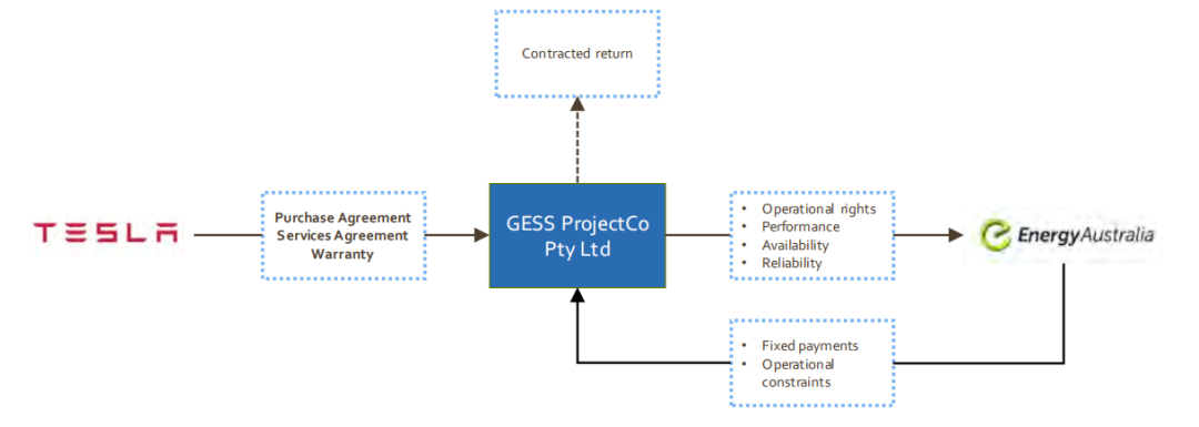 BSSA 還向 EnergyAustralia 提供電池性能、可用性和可靠性承諾,但須遵守運營限制,主要與循環(huán)次數(shù)和深度以及與共址的太陽能發(fā)電廠共享接入通道相關(guān)的調(diào)度容量限制。該電池采購協(xié)議為 GESS 提供了特斯拉對性能、可用性和可靠性的承諾。圖 2 概述了這些安排。