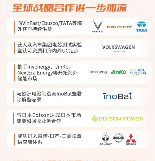 上半年,公司在歐美、東南亞、南美等地區(qū)新一代動(dòng)力電池和儲(chǔ)能電池生產(chǎn)線以及在印尼、阿根廷、美國(guó)等地的原材料基地逐步走向落地;與歐洲動(dòng)力電池制造商InoBat達(dá)成戰(zhàn)略合作,共同探索開拓歐洲市場(chǎng);與易捷特戰(zhàn)略合作,進(jìn)入雷諾-日產(chǎn)-三菱聯(lián)盟供應(yīng)商體系并供貨;還同越南車企VinFast共同打造越南首個(gè)磷酸鐵鋰電池制造工廠,加快布局東南亞市場(chǎng)。此外,公司與印度TATA、泰國(guó)Nuovo Plus、日本愛迪生能源等知名海外公司進(jìn)行戰(zhàn)略合作。
