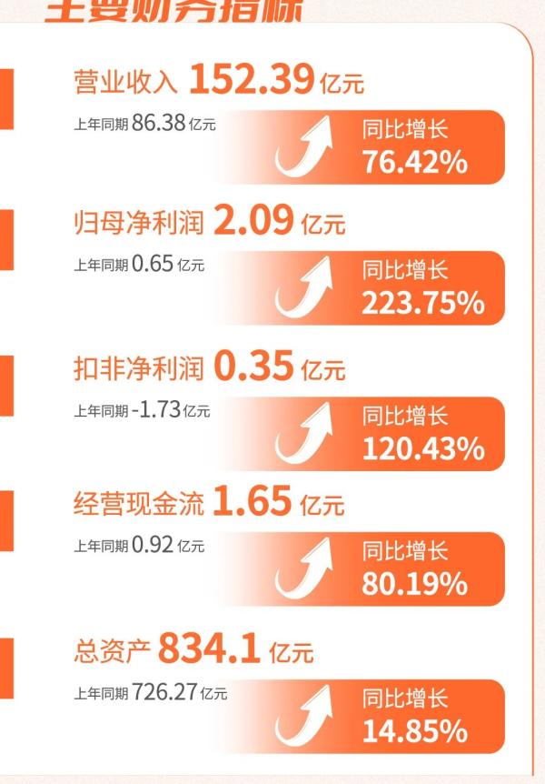 8月29日晚間,國(guó)軒高科(002074)發(fā)布了2023年半年度報(bào)告。報(bào)告期內(nèi),公司實(shí)現(xiàn)營(yíng)業(yè)收入152.39億元,同比增長(zhǎng)76.42%,公司歸母凈利潤(rùn)2.09億元,同比增長(zhǎng)223.75%。