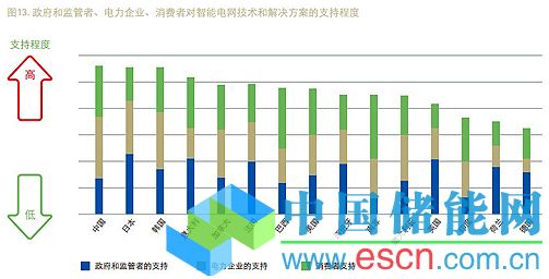 調(diào)查還提出,關(guān)于是否選擇智能電網(wǎng)技術(shù)和解決方案,政府/監(jiān)管者、消費(fèi)者和電力企業(yè)自身三個(gè)群體將發(fā)揮主要影響力。目前,三個(gè)群體都對(duì)智能電網(wǎng)部署項(xiàng)目表現(xiàn)出廣泛的支持。但是在不同國(guó)家和不同群體之間,仍存在一些顯著差異。(見(jiàn)圖13)