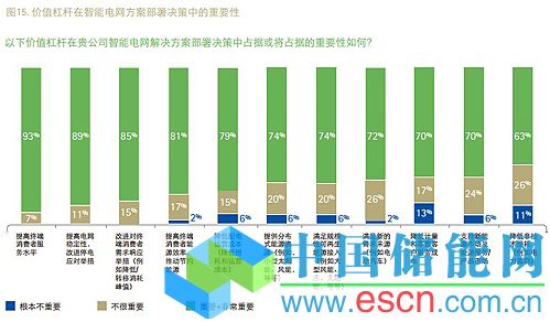 其次,在對(duì)于智能電網(wǎng)商業(yè)模式的評(píng)估中,調(diào)查注意到,智能電網(wǎng)技術(shù)和解決方案有潛力應(yīng)對(duì)許多關(guān)鍵的網(wǎng)絡(luò)挑戰(zhàn),受訪高管提出了各種各樣的價(jià)值杠桿,都顯示了部署智能電網(wǎng)的重要性和關(guān)鍵性。(見(jiàn)圖15)