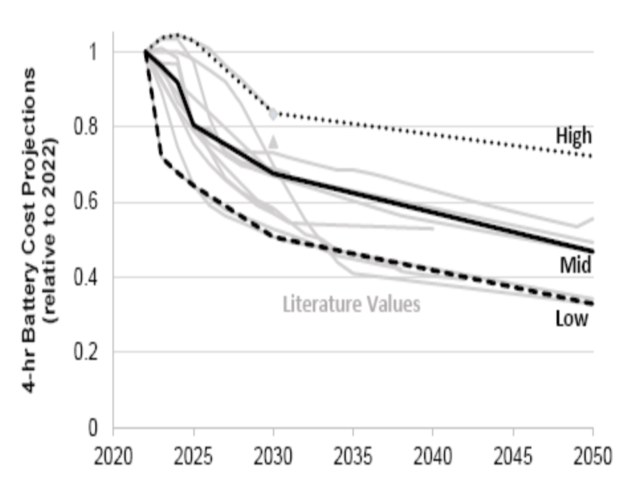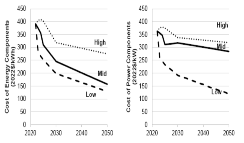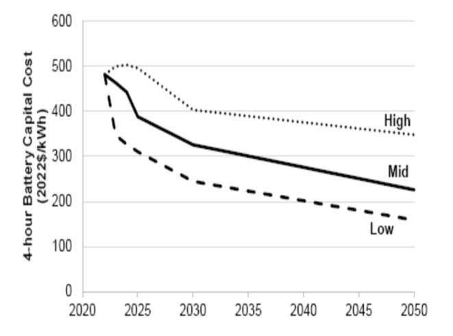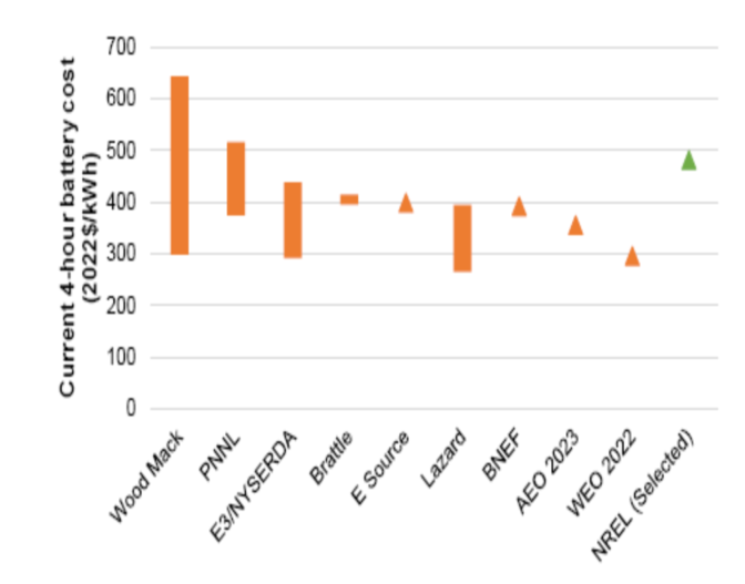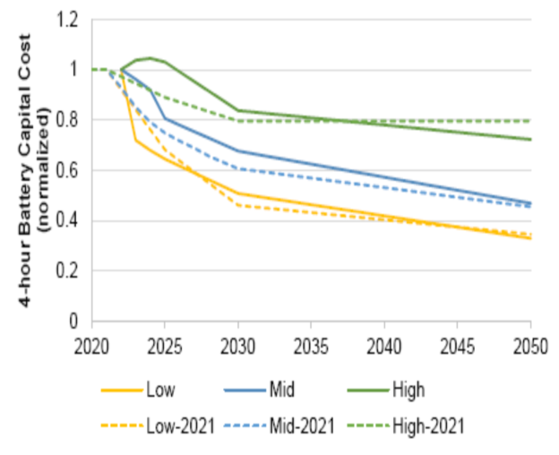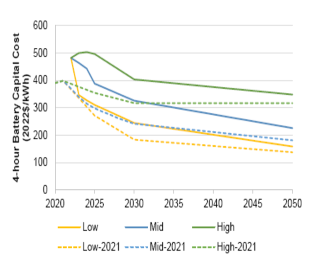 圖3.目前的電池儲能系統(tǒng)成本來自最近的研究報告,選擇NREL報告中的成本作為這項(xiàng)工作的2022年起始成本。