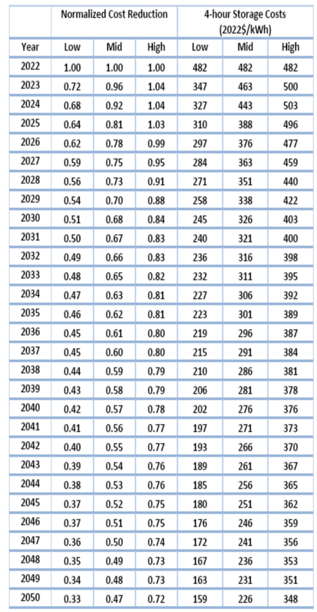 2025年、2030年和2050年之間的點(diǎn)是根據(jù)給定值的年份之間的線性值設(shè)置的。為了將這些標(biāo)準(zhǔn)化的低、中、高預(yù)測轉(zhuǎn)換為成本值,將電池儲能系統(tǒng)的標(biāo)準(zhǔn)化成本值乘以4小時,得出4小時電池儲能系統(tǒng)的儲能容量成本。