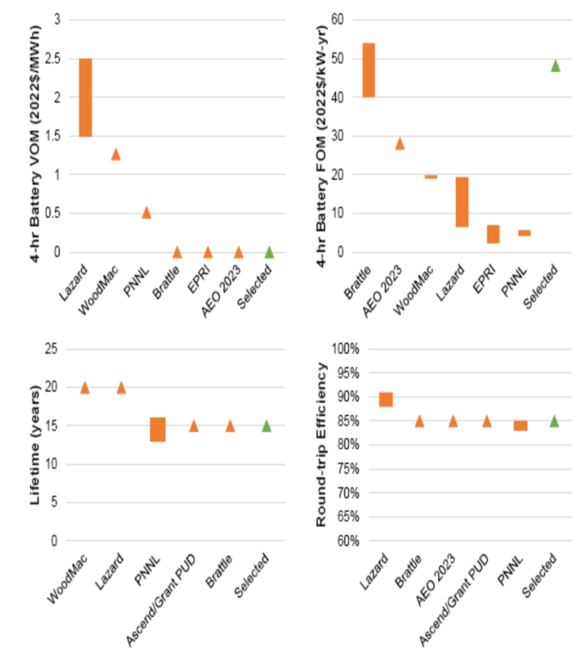 為了充分說明容量擴(kuò)展建模工具的電池儲能系統(tǒng)的成本和性能,除了投資之外,還需要評估其他參數(shù)。圖6顯示了來自調(diào)查報告的可變運(yùn)營和維護(hù)(VOM)、固定運(yùn)營和維護(hù)(FOM)、生命周期和充放電效率假設(shè)的范圍。圖中最右邊的點(diǎn)是NREL選擇的數(shù)據(jù),用來表示4小時電池儲能系統(tǒng)??勺冞\(yùn)營和維護(hù)(VOM)通常被認(rèn)為是零或接近零,NREL采用的VOM為零。