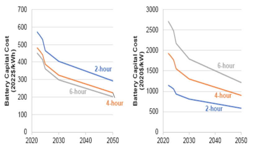 圖5使用中間成本預(yù)測的2小時、4小時和6小時電池的成本預(yù)測。左圖以美元/kWh為單位,右圖以美元/kW為單位。