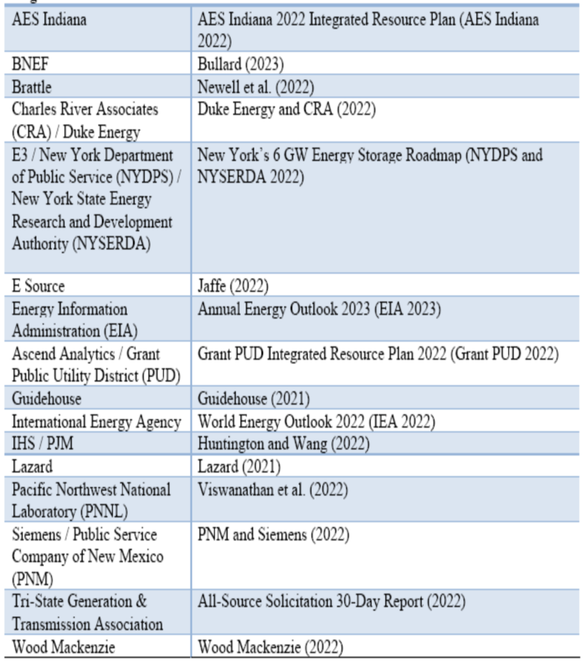 NREL的這份報告對于電池儲能系統(tǒng)的成本和性能預(yù)測使用基于一些研究報告的方法,其中預(yù)測通?;谶@些研究報告中的低值、中值和最高值。表1列出了在這項(xiàng)研究中提到的報告。由于電池儲能系統(tǒng)成本的快速變化和部署預(yù)期,NREL僅使用2022年和2023年發(fā)布的研究報告來進(jìn)行成本預(yù)測。除了參與表1中列出的報告之外,還參考了美國電力研究院(EPRI 2020)關(guān)于電池儲能系統(tǒng)運(yùn)營和維護(hù)和性能假設(shè)的2020年報告,但NREL沒有使用他們的成本預(yù)測,因?yàn)槠鋱蟾媸窃?022年之前發(fā)布的。