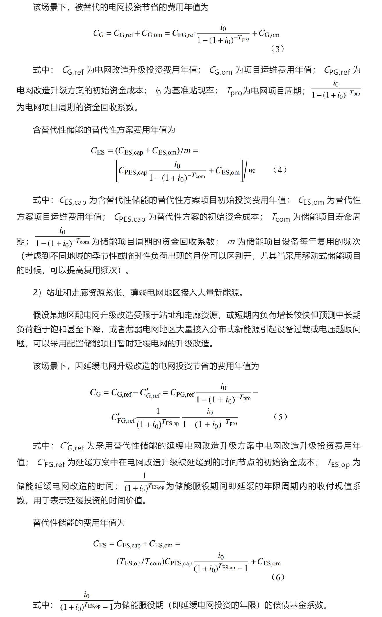 針對季節(jié)性或臨時性負荷增長、站址資源緊張、農(nóng)村電網(wǎng)大量接入分布式新能源等典型情況,通過技術經(jīng)濟性比較,若達到同等供電效果情況下,儲能投資全壽命周期成本小于電網(wǎng)建設成本、改造升級成本,可考慮利用新型儲能解決局部地區(qū)的輸配電容量或供電質(zhì)量問題,替代或延緩輸配電投資。