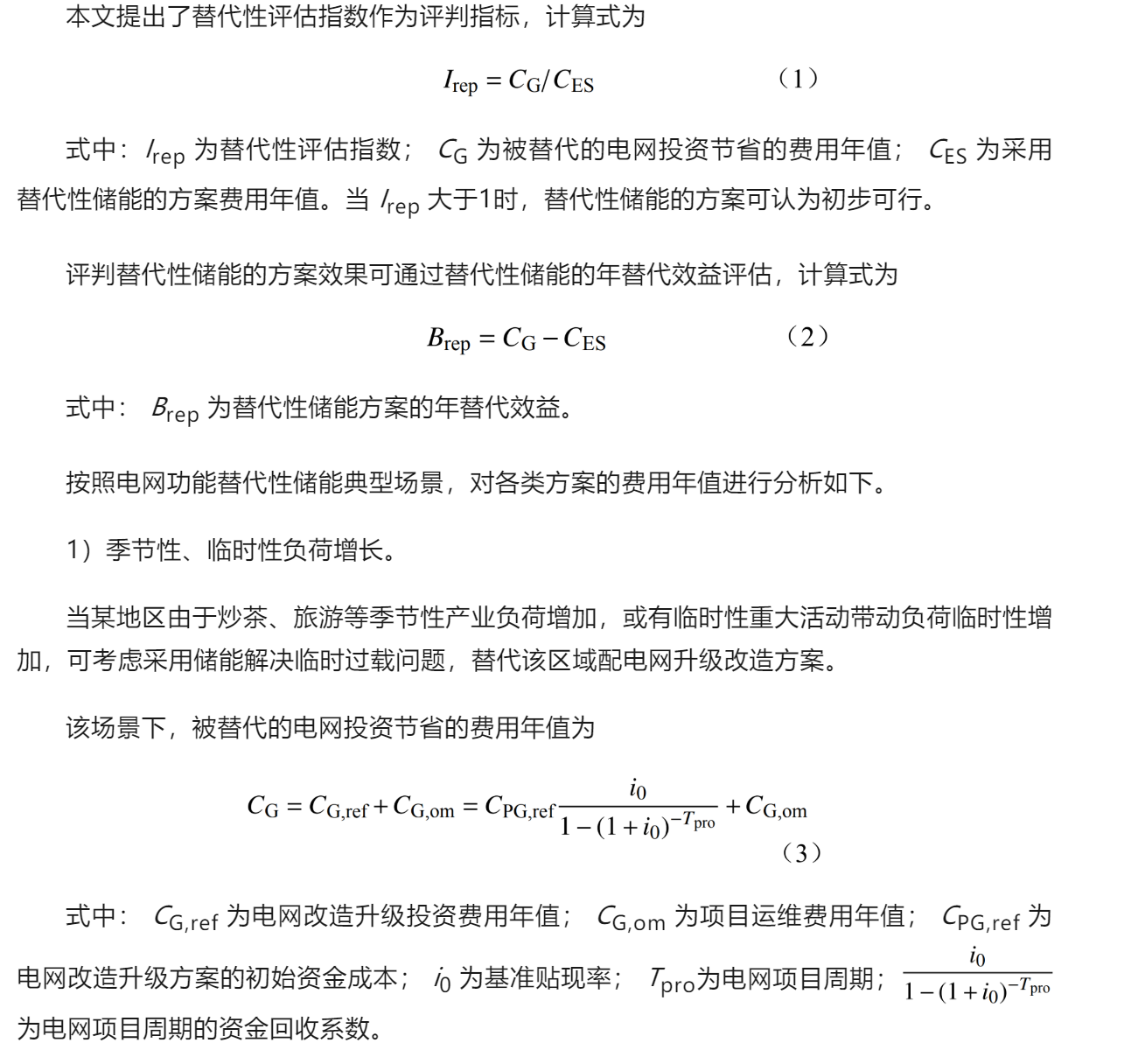 在國家政策大力支持下,中國新型儲能已在電力系統(tǒng)各個環(huán)節(jié)開展應用,部分項目已進入商業(yè)化運行階段。隨著儲能的技術經(jīng)濟性不斷提升,在一些應用場景下儲能建設可達到替代電網(wǎng)輸配電設施的效果,發(fā)揮解決基本供電問題、延緩輸變電升級改造需求、提升電網(wǎng)供電能力、提升應急保障能力和供電可靠性等作用[1-3]。國家政策明確支持電網(wǎng)功能替代性儲能發(fā)展,提出研究探索將電網(wǎng)替代性儲能設施成本收益納入輸配電價回收[4-5]。