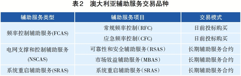 澳大利亞電力市場(chǎng)分為國家電力市場(chǎng)(NEM)和批發(fā)電力市場(chǎng)(WEM),除西澳大利亞州采用批發(fā)電力市場(chǎng)外,其他州執(zhí)行國家電力市場(chǎng)。2001年起,澳大利亞電力工業(yè)結(jié)構(gòu)重組并構(gòu)建統(tǒng)一電力市場(chǎng)體系,此時(shí)國家電力市場(chǎng)的輔助服務(wù)品種主要包含頻率控制輔助服務(wù)(FCAS)。2009年,澳大利亞重新建立電力監(jiān)管體系,國家電力市場(chǎng)的輔助服務(wù)品種進(jìn)行相應(yīng)的擴(kuò)充。截至2022年,澳大利亞國家電力市場(chǎng)的輔助服務(wù)品種如表2所示。
