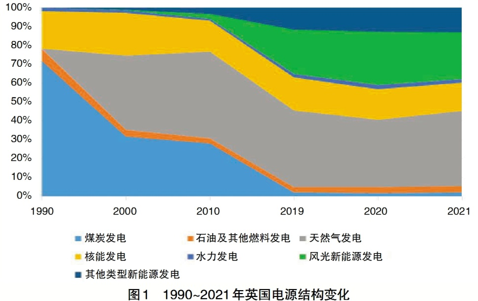 2019年,英國通過《氣候變化法案》,明確2050年脫碳的目標(biāo),但由于新型冠狀病毒肺炎疫情的流行及俄烏沖突導(dǎo)致的能源供需急劇變化讓英國的能源轉(zhuǎn)型備受挑戰(zhàn),圖1為1990~2021年英國電源結(jié)構(gòu)變化情況,2021年英國全國發(fā)電出力相較于2020年下降1.4個(gè)百分點(diǎn)。同時(shí),受極端天氣影響,新能源出力占比由2020年的43.2%下降至2021年的39.7%。但新能源出力占比依然較前幾年有較大的提升。