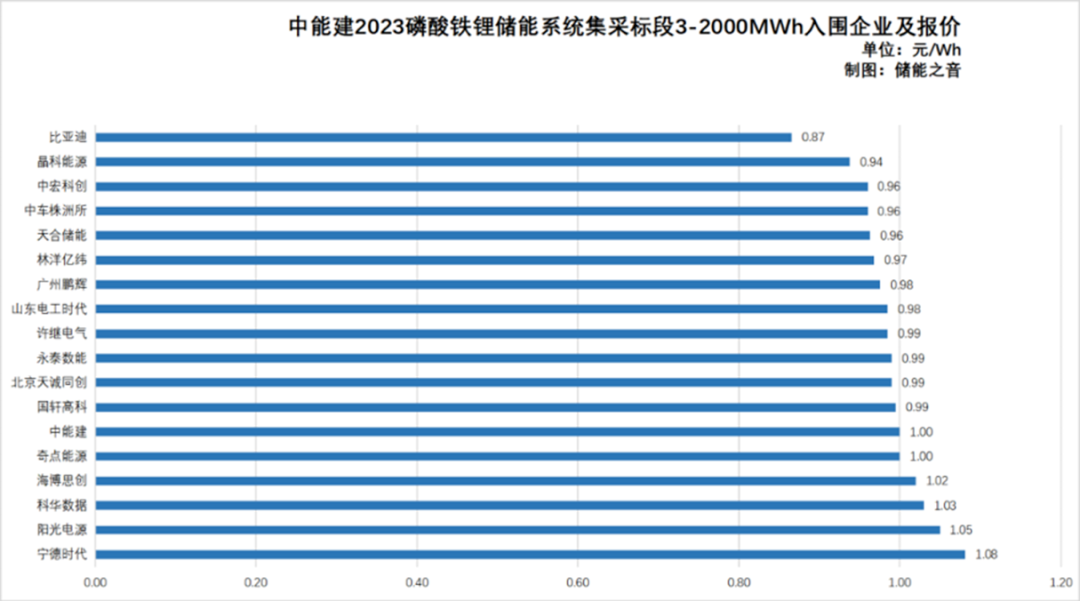 然后,在今年7月底公示的“中國能建2023年度磷酸鐵鋰電池儲(chǔ)能系統(tǒng)集中采購結(jié)果”顯示,比亞迪直接報(bào)出了全場最低價(jià),為0.87元/Wh,再次刷新了行業(yè)認(rèn)知,成為業(yè)內(nèi)又一條巨大的“低價(jià)鯰魚”。