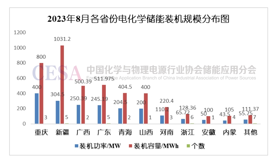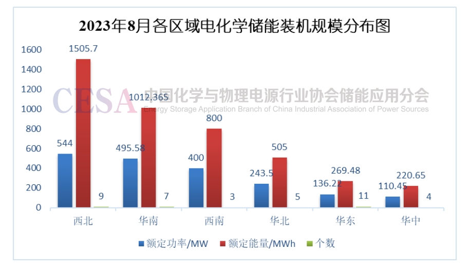 圖3 2023年8月各區(qū)域電化學(xué)儲能裝機(jī)規(guī)模分布圖