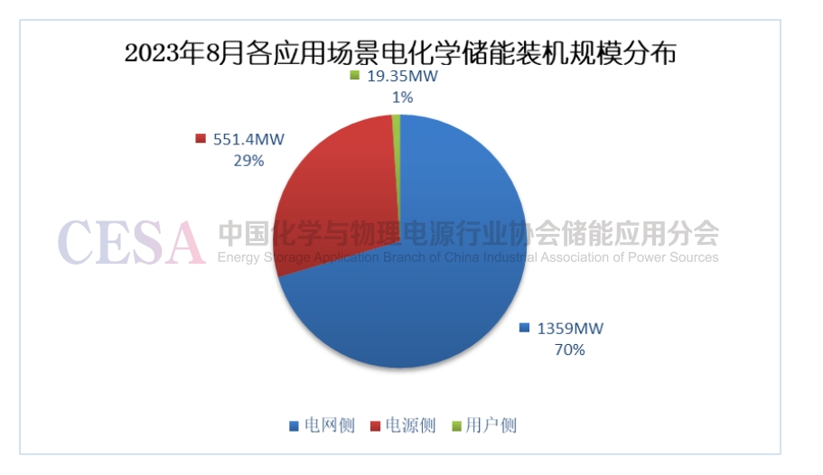 圖2 2023年8月各應(yīng)用場景電化學(xué)儲能裝機(jī)規(guī)模分布圖