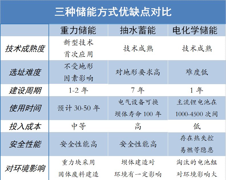 目前大家常聽到的儲能方式有「抽水蓄能」「化學儲能」,三者各有各的特點,咱們一先看一張表。