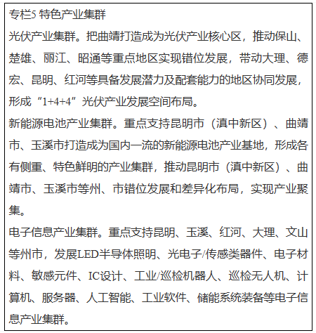 按照“優(yōu)化布局、分類集聚、錯位發(fā)展、優(yōu)勢互補、突出特色”的原則,以滇中地區(qū)為核心,大理、紅河、文山、保山、德宏、麗江等州市為聯(lián)動發(fā)展區(qū),高起點、高規(guī)格、高標準培育建設一批光伏、新能源電池、電子信息產(chǎn)業(yè)等特色產(chǎn)業(yè)集群、產(chǎn)業(yè)園區(qū)。