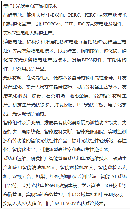 發(fā)揮我省光伏產(chǎn)業(yè)基礎、資源稟賦和區(qū)位優(yōu)勢,重點發(fā)展N型高效電池和組件等產(chǎn)業(yè)鏈環(huán)節(jié),加快引進BIPV光伏構(gòu)件、柔性薄膜電池、鈣鈦礦及疊層電池等新型光伏產(chǎn)品,提升電子漿料、光伏背板、光伏玻璃、電子化學品等關鍵光伏輔材產(chǎn)業(yè)化能力。加快智能光伏創(chuàng)新突破,鼓勵發(fā)展集電力變換、遠程控制、在線分析、環(huán)境自適應等于一體的組件、逆變器、控制系統(tǒng)、匯流箱、跟蹤系統(tǒng)、接線盒等智能型關鍵部件。鼓勵開發(fā)安全便捷的戶用智能光伏系統(tǒng)和光伏充電寶、穿戴裝備、交通工具等移動能源產(chǎn)品。探索建立光伏“碳足跡”評價標準并開展認證。加快構(gòu)建光伏供應鏈溯源體系,推動光伏組件回收利用技術研發(fā)及產(chǎn)業(yè)化應用。