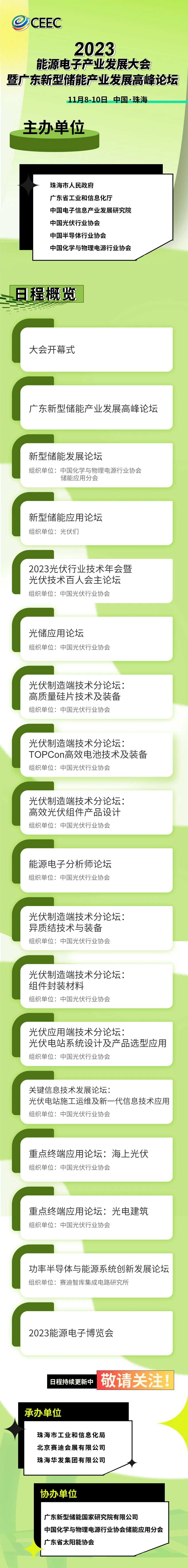 為加快推進(jìn)電子信息技術(shù)與新型儲(chǔ)能協(xié)同發(fā)展,推動(dòng)多領(lǐng)域跨界融合、協(xié)同創(chuàng)新,積極探索新型產(chǎn)品形態(tài)、商業(yè)模式和生態(tài)關(guān)系,鞏固我國(guó)新型儲(chǔ)能國(guó)際競(jìng)爭(zhēng)優(yōu)勢(shì)。珠海市人民政府、廣東省工業(yè)和信息化廳、中國(guó)電子信息產(chǎn)業(yè)發(fā)展研究院、中國(guó)光伏行業(yè)協(xié)會(huì)、中國(guó)半導(dǎo)體行業(yè)協(xié)會(huì)、中國(guó)化學(xué)與物理電源行業(yè)協(xié)會(huì)等單位聯(lián)合召開“2023能源電子產(chǎn)業(yè)發(fā)展大會(huì)暨廣東新型儲(chǔ)能產(chǎn)業(yè)發(fā)展高峰論壇”。