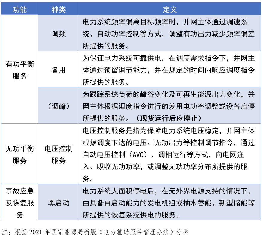 國家能源局2021年12月印發(fā)的《電力輔助服務(wù)管理辦法》對電力輔助服務(wù)的定義為:為維持電力系統(tǒng)安全穩(wěn)定運行,保證電能質(zhì)量,促進清潔能源消納,除正常電能生產(chǎn)、輸送、使用外,由火電、水電、核電、風(fēng)電、光伏發(fā)電、光熱發(fā)電、抽水蓄能、自備電廠等發(fā)電側(cè)并網(wǎng)主體,電化學(xué)、壓縮空氣、飛輪等新型儲能,傳統(tǒng)高載能工業(yè)負荷、工商業(yè)可中斷負荷、電動汽車充電網(wǎng)絡(luò)等能夠響應(yīng)電力調(diào)度指令的可調(diào)節(jié)負荷(含通過聚合商、虛擬電廠等形式聚合)提供的服務(wù)。