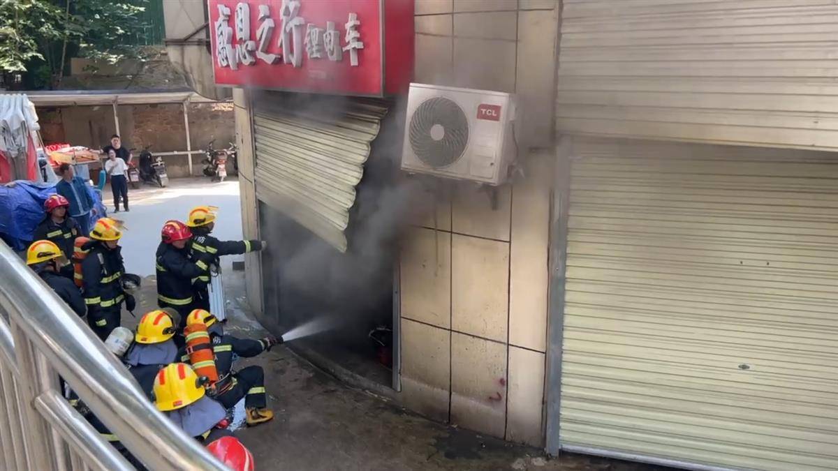 消防員到達(dá)現(xiàn)場后發(fā)現(xiàn),一電動(dòng)自行車商鋪卷簾門緊閉,里面冒出濃濃黑煙。消防員迅速設(shè)立警戒區(qū)域,并對(duì)圍觀群眾進(jìn)行疏散。因店主不在現(xiàn)場無法開門,消防員利用無齒鋸和板斧對(duì)卷簾門進(jìn)行破拆,在卷簾門被打開后,發(fā)現(xiàn)店內(nèi)存放著大量電動(dòng)自行車及各類配件和鋰電池。消防員立即用水槍對(duì)起火位置進(jìn)行滅火,經(jīng)過近5分鐘的緊張撲救,現(xiàn)場明火被熄滅。隨后,消防員仔細(xì)檢查現(xiàn)場,確認(rèn)無復(fù)燃危險(xiǎn)后撤離。