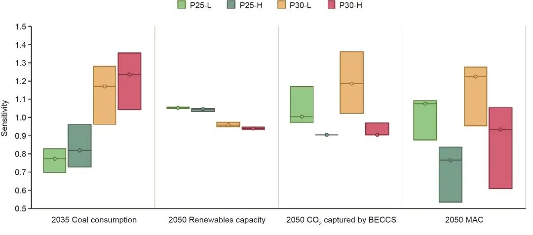 圖11. 2035年煤炭消費(fèi)、2050年可再生能源裝機(jī)容量、2050年BECCS產(chǎn)生的負(fù)排放和2050年邊際減排成本的靈敏性分析。在固定峰值水平、達(dá)峰時間和2050年排放水平的情況下,2011—2050年每個靈敏性情景下累計(jì)排放增加或減少5%。根據(jù)基礎(chǔ)情景的平均值對結(jié)果進(jìn)行歸一化處理。箱型圖中的空心點(diǎn)代表了基礎(chǔ)情景下的數(shù)值。