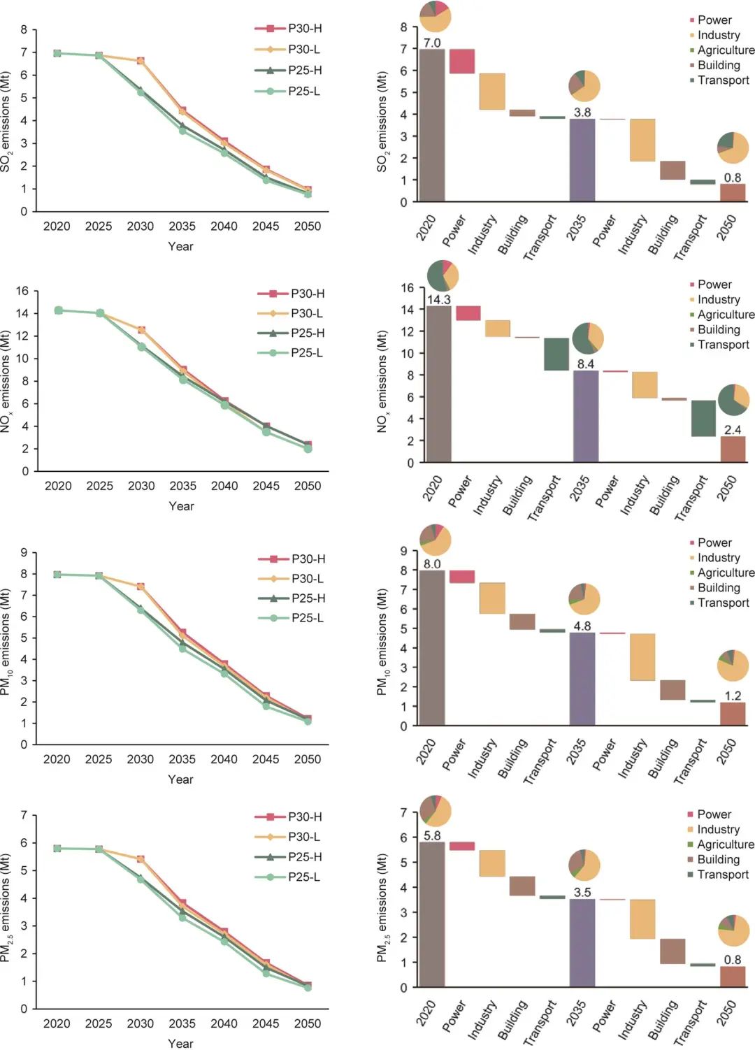 圖10. CO2減排對局地空氣污染物治理的協(xié)同效應(yīng)(左)和P25-H情景下,2020—2035年和2035—2050年兩段時期,各部門對于局地空氣污染物減排的貢獻(xiàn)分解(右)。