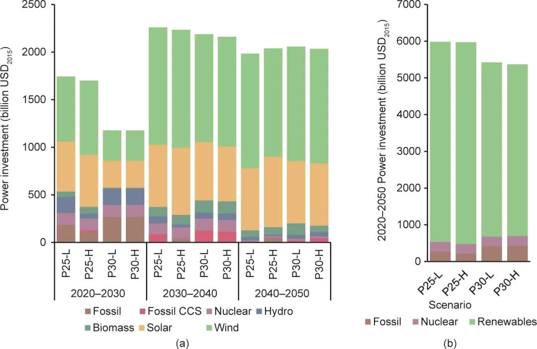 圖9. 電力部門不同技術(shù)投資(a)和2020—2050年電力部門總投資(b)。USD2015表示采用2015年美元不變價,并且按照2015年官方公布的匯率將人民幣轉(zhuǎn)換為美元進(jìn)行統(tǒng)計(jì)。