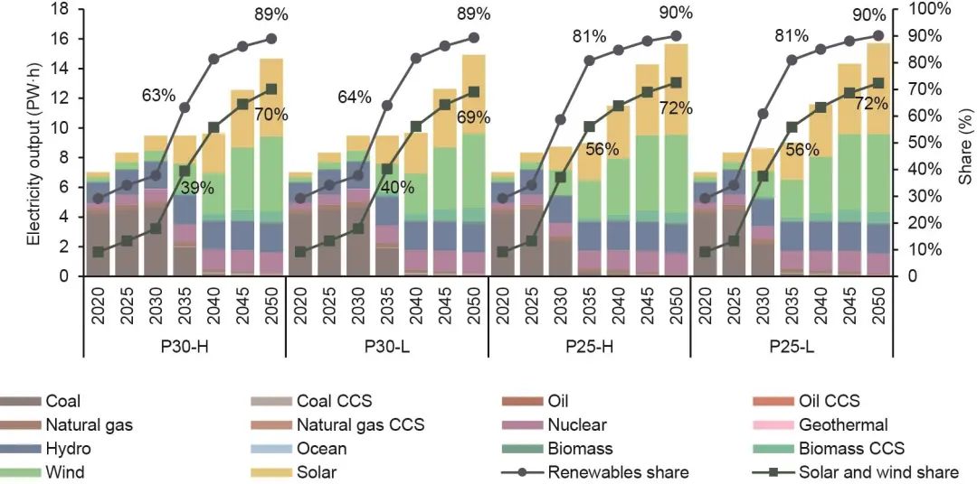 (2)中國需要在電力部門快速推廣可再生能源取代化石能源,同時由于可再生能源的高滲透率給電力系統(tǒng)的供需匹配帶來挑戰(zhàn),中國應(yīng)當(dāng)重視儲能設(shè)施的配套發(fā)展。