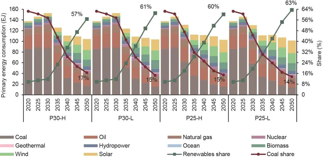 相比之下,可再生能源目前占一次能源消費(fèi)的10%,同時增長緩慢,主要是為了滿足增量能源需求。未來,可再生能源將最有希望填補(bǔ)由煤炭消費(fèi)下降造成的缺口,從而逐步取代化石燃料。據(jù)測算,在2035—2040年,可再生能源將超越化石燃料,成為中國最主要的能源。到2050年,中國一次能源消費(fèi)中可再生能源比重將達(dá)到約60%。同樣,對于2050年碳預(yù)算較低或者開始減排較早的情景(P25-L、P25-H和P30-L),可再生能源的占比將更高。