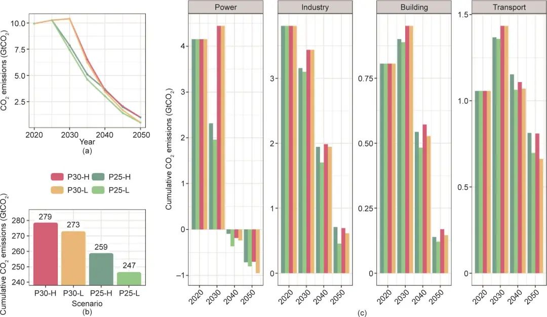 圖2. (a)能源系統(tǒng)減排路徑;(b)2011—2050年累計(jì)碳排放;(c)分部門碳排放情況。