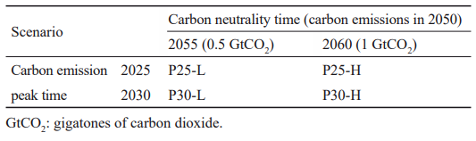 為了探討碳達(dá)峰時間和碳中和時間差異對能源系統(tǒng)轉(zhuǎn)型的影響,設(shè)計(jì)了以下4個轉(zhuǎn)型情景(表1)。
