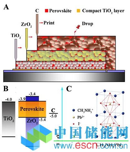 圖A、全印刷介觀鈣鈦礦太陽(yáng)能電池結(jié)構(gòu)示意圖;B、能級(jí)示意圖;C、鈣鈦礦MAPbI3晶體結(jié)構(gòu)示意圖。