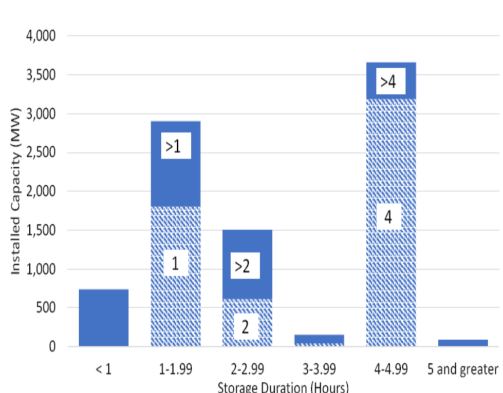 從歷史上來看,4小時儲能系統(tǒng)非常適合在美國許多地區(qū)的夏季峰值電力需求期間提供容量服務(wù),這導(dǎo)致一些批發(fā)市場地區(qū)采用了“4小時容量規(guī)則”。該規(guī)則允許持續(xù)4小時以上的儲能系統(tǒng)在容量市場或其他提供容量的合同中獲得補償(在更長的持續(xù)時間內(nèi)不會提供額外的收入)。4小時容量規(guī)則、能源套利的額外價值有限以及鋰離子電池成本下降,對于部署持續(xù)時間超過4小時的長時儲能系統(tǒng)產(chǎn)生了抑制作用?;谶@一規(guī)則,在2021年和2022年美國部署的儲能系統(tǒng)約有40%是持續(xù)時間4小時的儲能系統(tǒng),不到6%的儲能系統(tǒng)持續(xù)時間超過4小時。