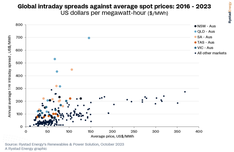 根據(jù)調(diào)研機(jī)構(gòu)Rystad Energy公司最近進(jìn)行的一項(xiàng)研究,根據(jù)公開數(shù)據(jù),在全球39個(gè)電力市場(chǎng)中,澳大利亞國家電力市場(chǎng)(NEM)的日內(nèi)電價(jià)波動(dòng)幅度最大。緊隨其后的是日本和菲律賓的電力市場(chǎng),以及美國的加利福尼亞州和德克薩斯州。