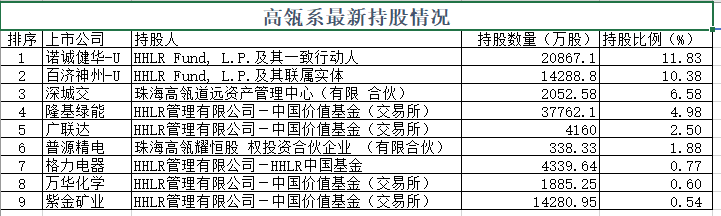 高領(lǐng)系其余持股公司深城交(301091.SZ)、廣聯(lián)達(dá)(002410.SZ)、格力電器(000651.SZ)、萬華化學(xué)(600309.SH)、紫金礦業(yè)(601899.SH)等公司則并未公告高瓴參與了轉(zhuǎn)融通業(yè)務(wù)。但值得注意的是,這些公司中,除深城交持股比例超過5%的股權(quán)變動信息披露紅線,其他高瓴系公司在上市公司中的持股都低于5%。今年三季報中,上述股權(quán)除隆基綠能被減持外,其他都沒有減持跡象。