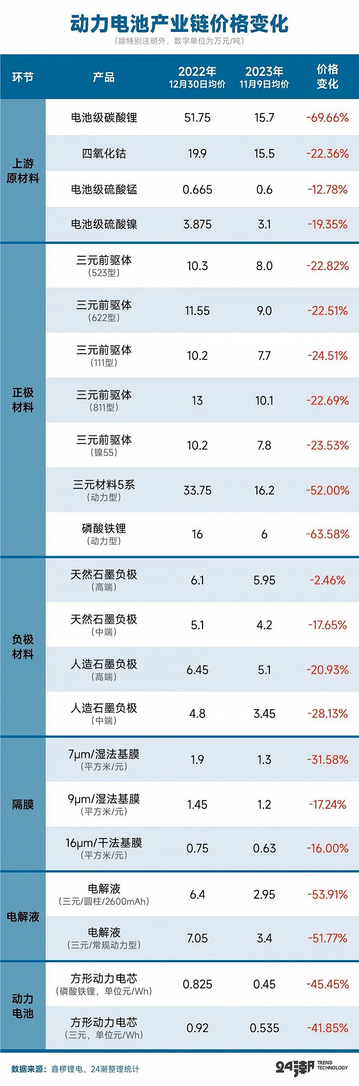 如下表所示,2023年初至今,動(dòng)力電池產(chǎn)業(yè)鏈價(jià)格全線下跌,其中動(dòng)力電池價(jià)格跌幅超40%。