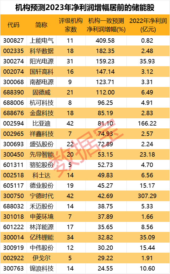 證券時(shí)報(bào)·數(shù)據(jù)寶統(tǒng)計(jì),根據(jù)5家及以上機(jī)構(gòu)一致預(yù)測(cè),2023年多數(shù)儲(chǔ)能股業(yè)績(jī)將穩(wěn)定增長(zhǎng)。23股機(jī)構(gòu)預(yù)測(cè)今年凈利潤(rùn)增幅有望超過(guò)20%;其中上能電氣(300827)、科華數(shù)據(jù)(002335)、陽(yáng)光電源、國(guó)軒高科(002074)、南都電源(300068)、固德威6股今年凈利潤(rùn)有望翻倍。