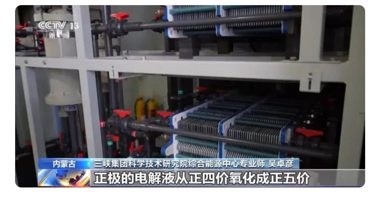 三峽集團(tuán)科學(xué)技術(shù)研究院綜合能源中心專(zhuān)業(yè)師吳卓彥:這套系統(tǒng)就是全釩液流電池儲(chǔ)能系統(tǒng),它的能量主要儲(chǔ)存在電解液中。在工作的時(shí)候,電解液通過(guò)管路還有泵,來(lái)到電堆。充電的時(shí)候,正極的電解液從正四價(jià)氧化成正五價(jià),把電能儲(chǔ)存起來(lái),在放電的時(shí)候,它從正五價(jià)再回到正四價(jià),把電能釋放出去。