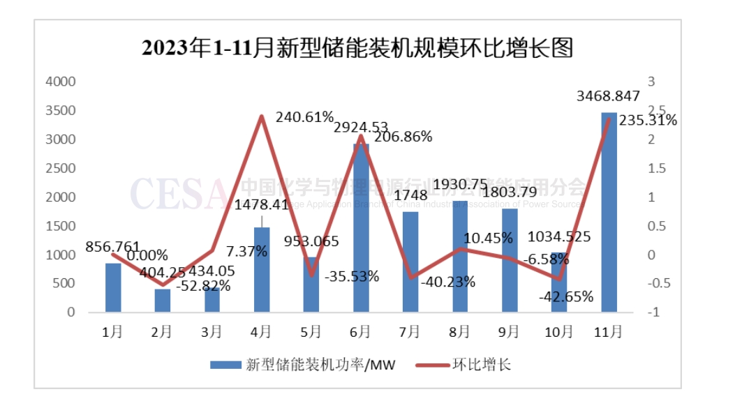 圖1 2023年1-11月新型儲能裝機規(guī)模環(huán)比增長圖