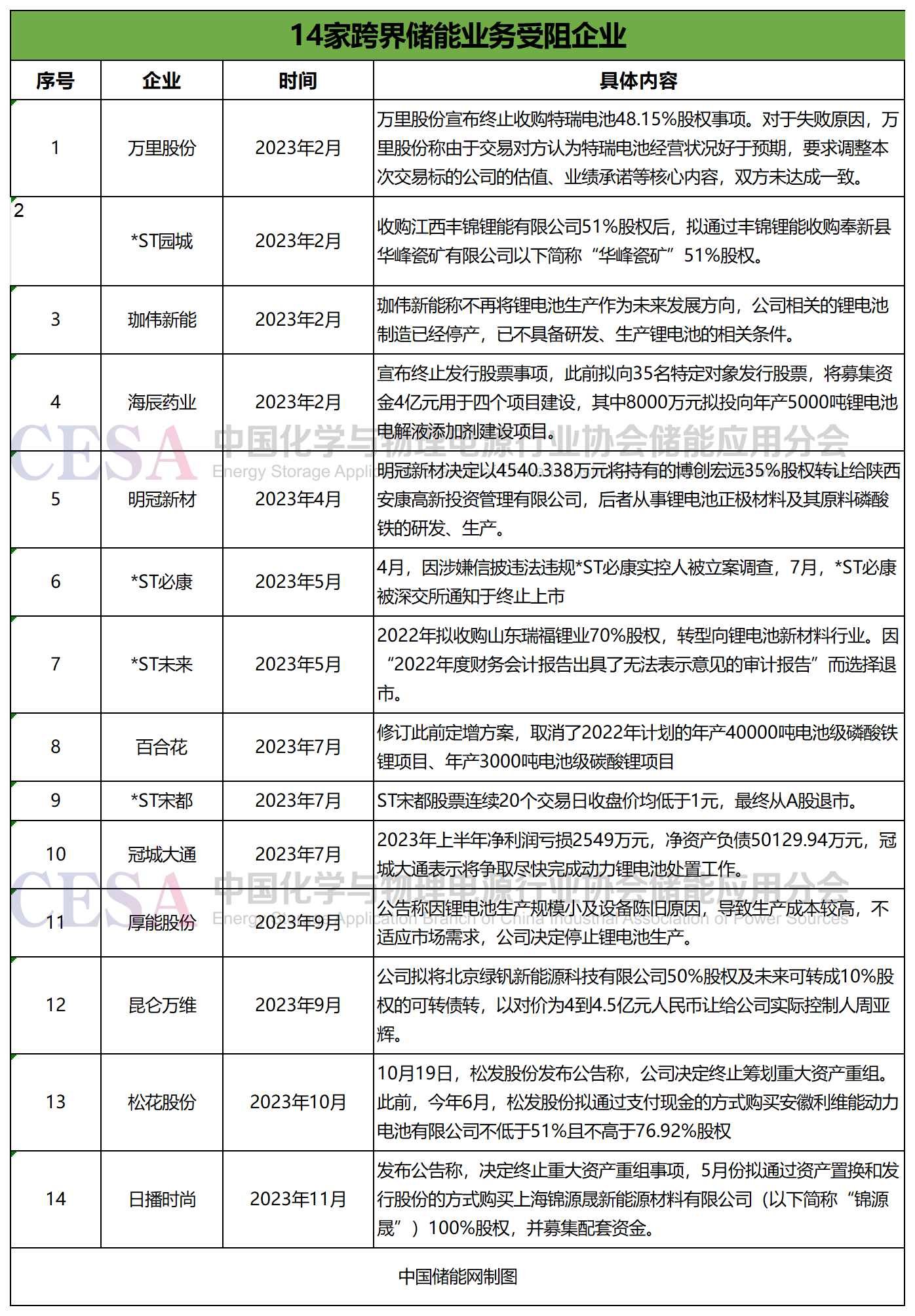 據(jù)不完全統(tǒng)計,今年已經有14家跨界儲能企業(yè)業(yè)務受阻,有的放棄儲能業(yè)務,有的轉型失敗,直接退市。
