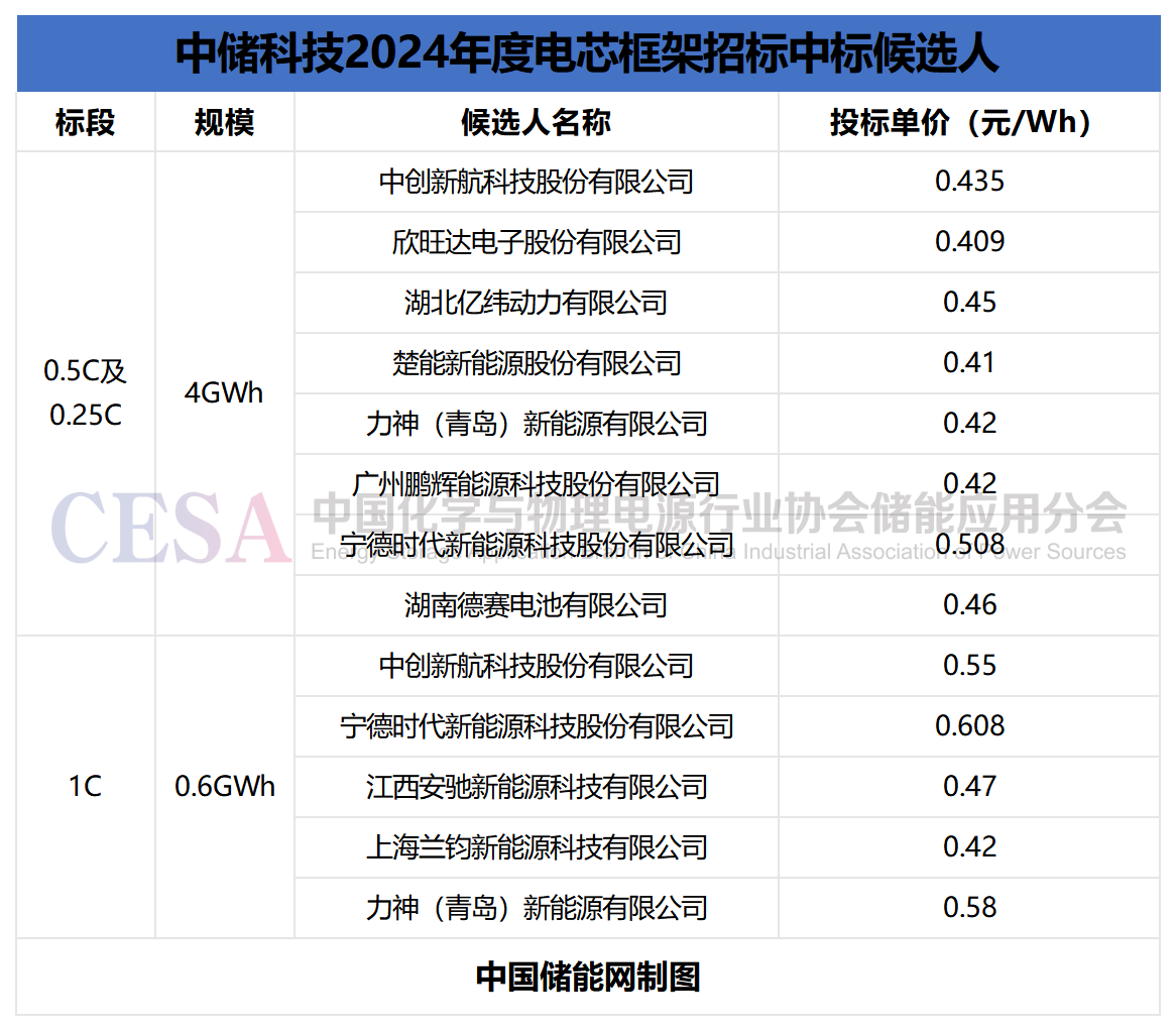 12月24日,中儲科技公示2024年度電芯框架招標中標候選人,兩個段共有10個候選人入圍。