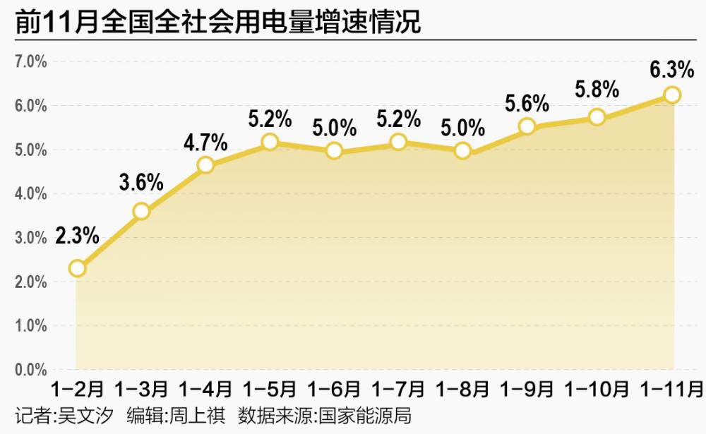 根據(jù)國(guó)家能源局日前公布數(shù)據(jù),今年1~11月,全社會(huì)用電量累計(jì)83678億千瓦時(shí),同比增長(zhǎng)6.3%。11月,全社會(huì)用電量7630億千瓦時(shí),同比增長(zhǎng)11.6%。