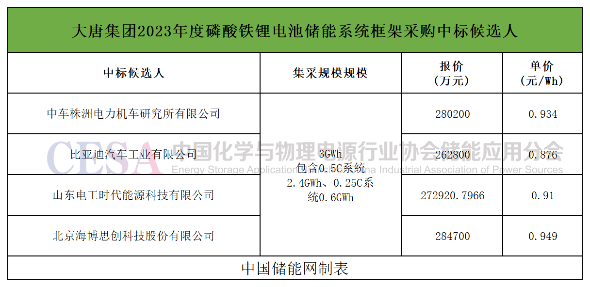 12月26日,大唐集團(tuán)發(fā)布了2024年度磷酸鐵鋰電池儲(chǔ)能系統(tǒng)框架采購招標(biāo)公告,預(yù)估采購總?cè)萘?GWh,包括0.5C儲(chǔ)能系統(tǒng)1GWh和0.25C儲(chǔ)能系統(tǒng)1GWh。
