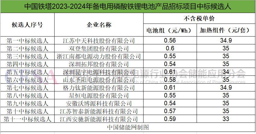 第一中標候選人江蘇中天科技股份有限公司、第二中標候選人雙登集團股份有限公司、第三中標候選人浙江南都電源動力股份有限公司、第四中標候選人深圳拓邦股份有限公司、第五中標候選人深圳昆宇電源科技有限公司、第六中標候選人山東圣陽電源股份有限公司、第七中標候選人格力鈦新能源股份有限公司、第八中標候選人星恒電源股份有限公司、第九中標候選人安徽沃博源科技有限公司、第十中標候選人江蘇智泰新能源科技有限公司、第十一中標候選人江西安馳新能源科技有限公司。