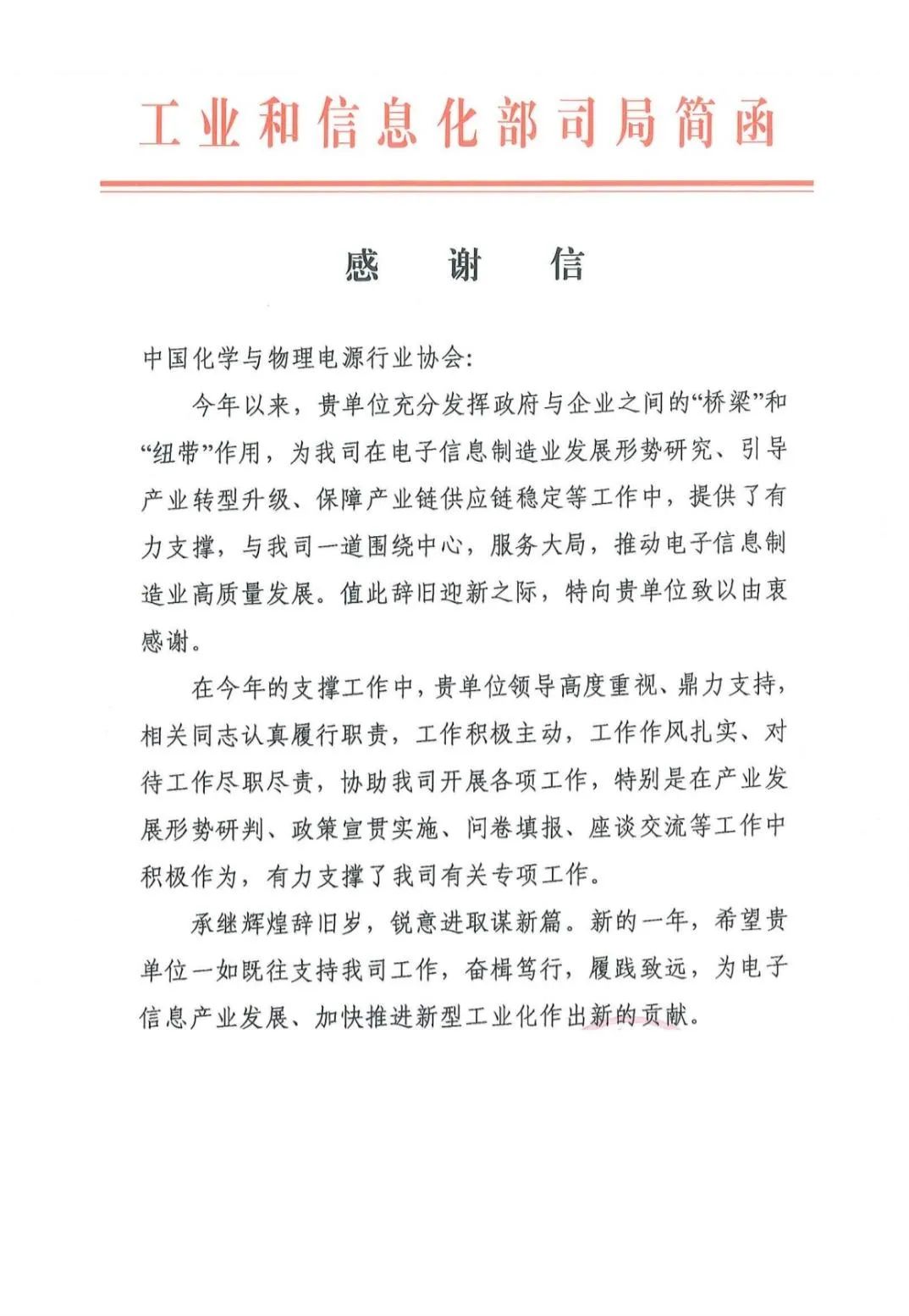 中國(guó)儲(chǔ)能網(wǎng)訊:近日,工業(yè)和信息化部電子信息司發(fā)來(lái)感謝信,充分肯定我會(huì)在政府和企業(yè)之間發(fā)揮的“橋梁”和“紐帶”作用。為該司在電子信息制造業(yè)發(fā)展形勢(shì)研究、引導(dǎo)產(chǎn)業(yè)轉(zhuǎn)型升級(jí)、保障產(chǎn)業(yè)鏈供應(yīng)鏈穩(wěn)定等工作中提供里有力支撐。