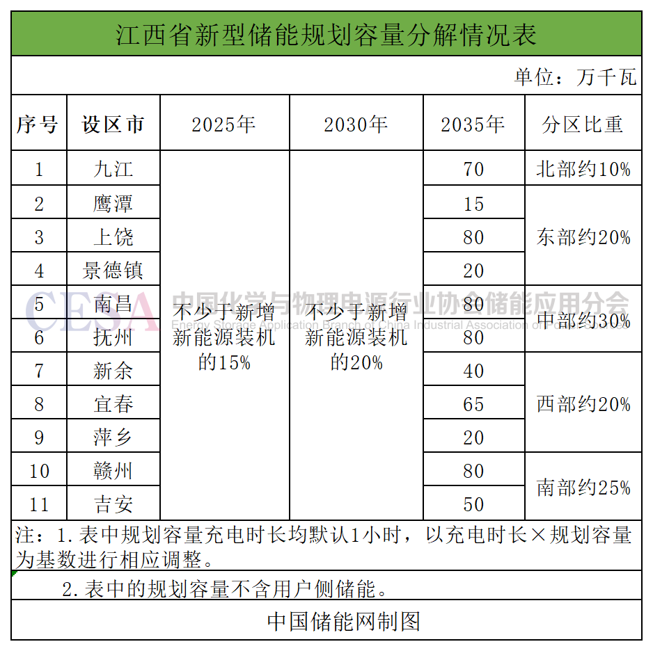 《規(guī)劃》提出,江西省到2025年、2030年,力爭(zhēng)實(shí)現(xiàn)各設(shè)區(qū)市新型儲(chǔ)能投產(chǎn)規(guī)模不少于新增新能源裝機(jī)的15%、20%。到2035年,力爭(zhēng)實(shí)現(xiàn)全省新型儲(chǔ)能投產(chǎn)6GW以上。