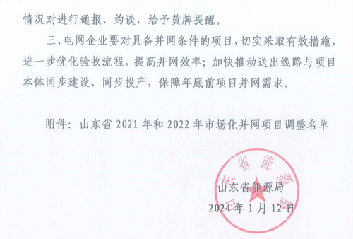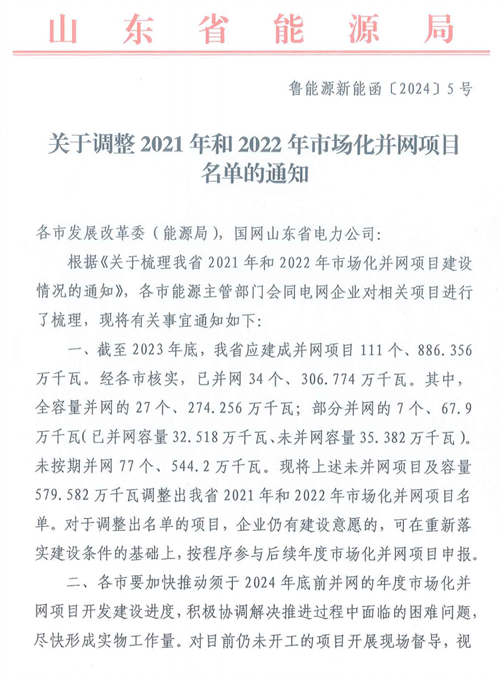 中國儲能網(wǎng)訊:1月12日,山東能源局發(fā)布文件《關(guān)于調(diào)整2021年和2022年市場化并網(wǎng)項目名單的通知》,將未按時并網(wǎng)項目及容量579.582萬千瓦調(diào)整出2021年和2022年市場化并網(wǎng)項目名單。