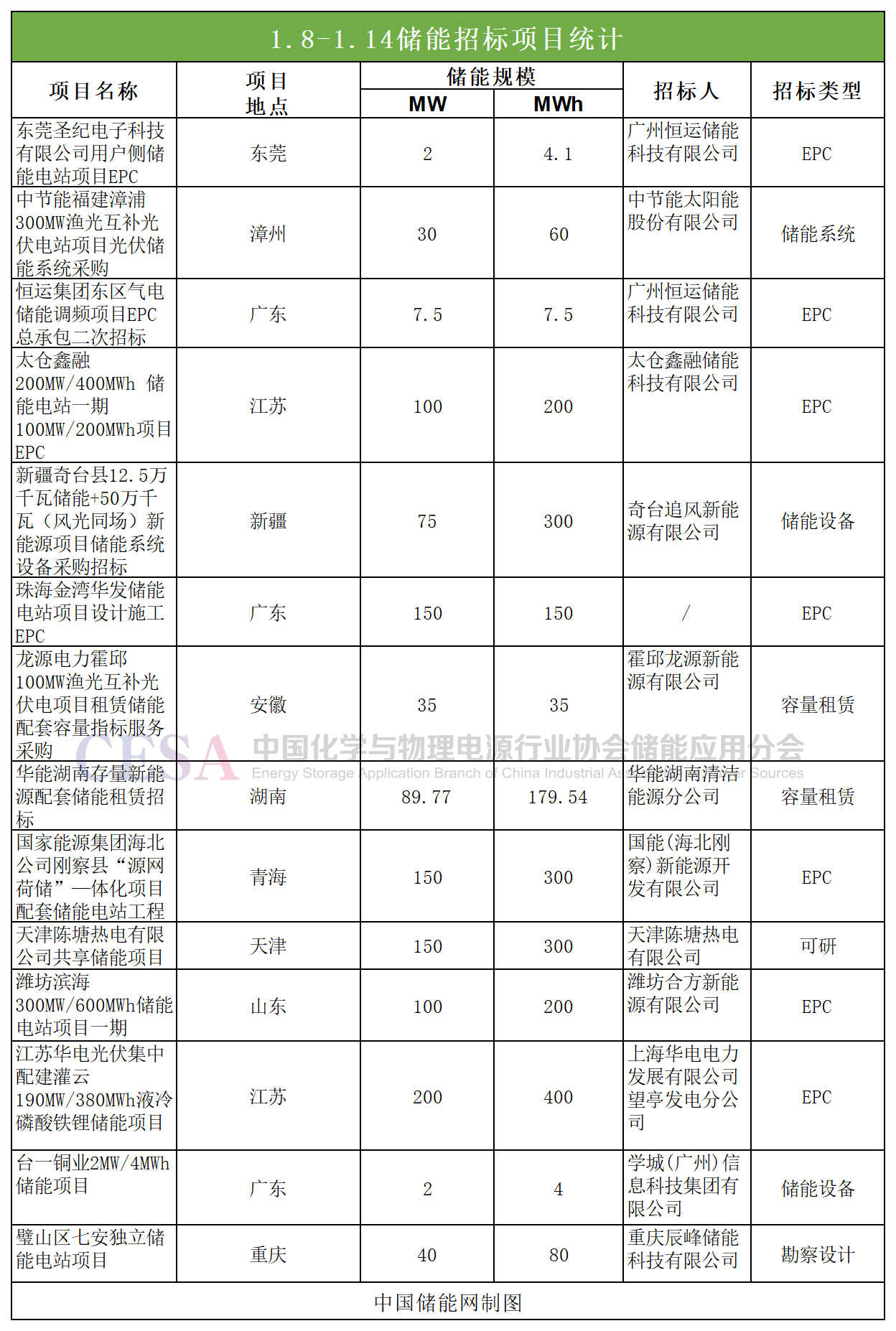 中國儲(chǔ)能網(wǎng)訊:2024年第二周,據(jù)中國儲(chǔ)能網(wǎng)不完全統(tǒng)計(jì),共有1.13GW/2.22GWh項(xiàng)目招標(biāo),主要以儲(chǔ)能EPC項(xiàng)目招標(biāo)為主。其中包括兩個(gè)儲(chǔ)能容量租賃項(xiàng)目,容量規(guī)模為214.54MWh。