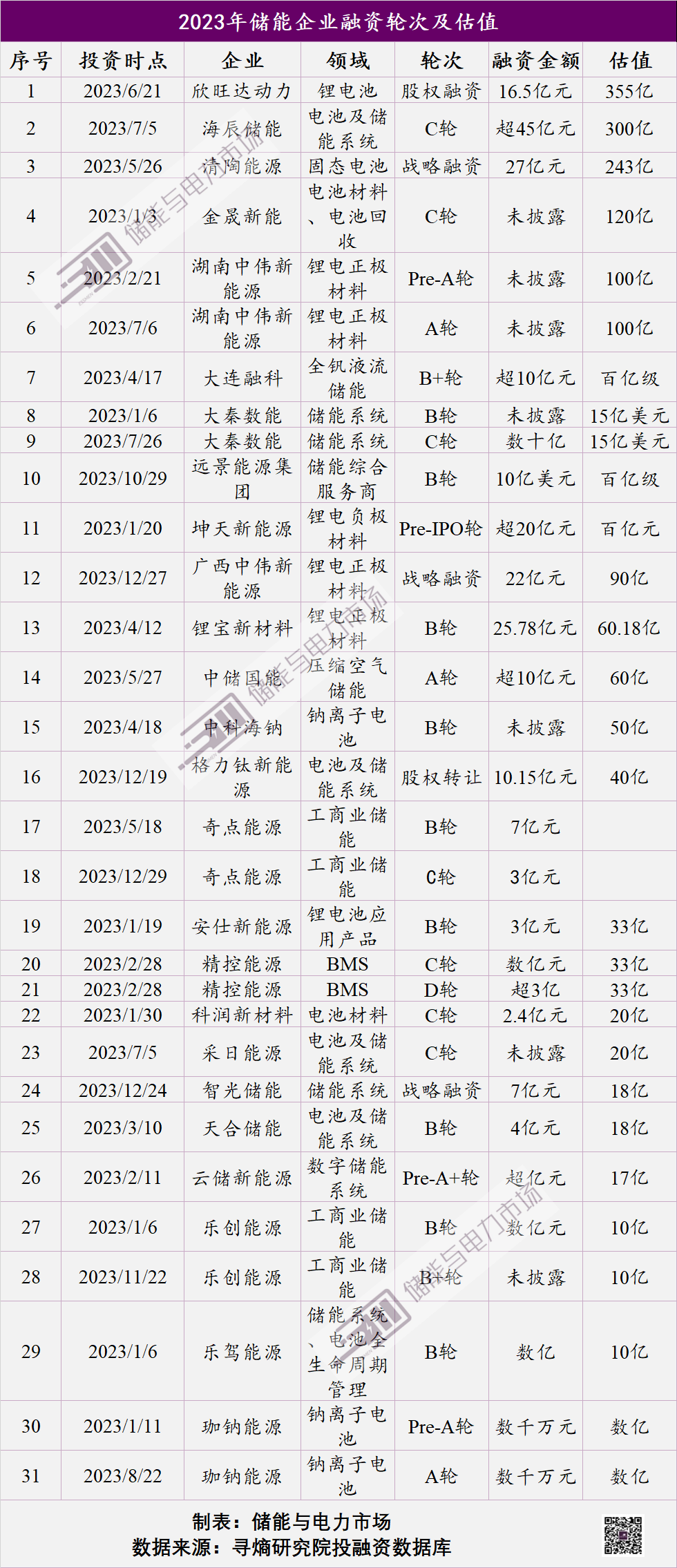 根據(jù)目前已披露估值情況,達到百億級估值的企業(yè)有9家,其中欣旺達動力的估值最高,為355億,海辰儲能300億,清陶能源243億。